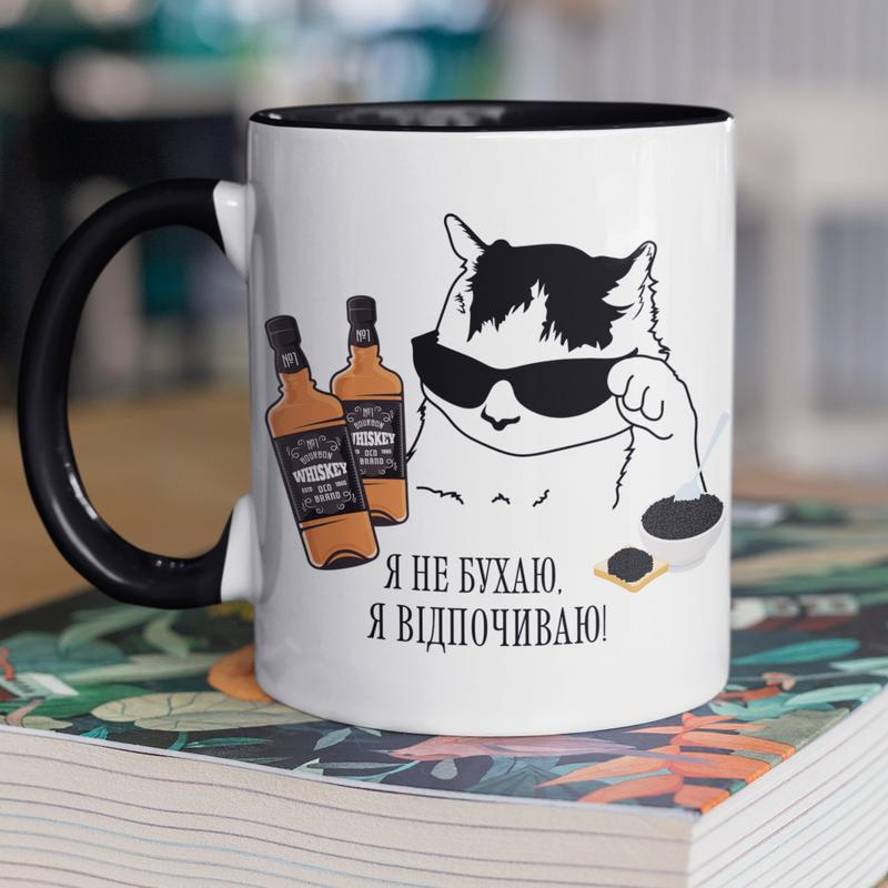 Чашка керамічна з принтом "я не бухаю, я відпочиваю" 330 мл, біла з чорною ручкою