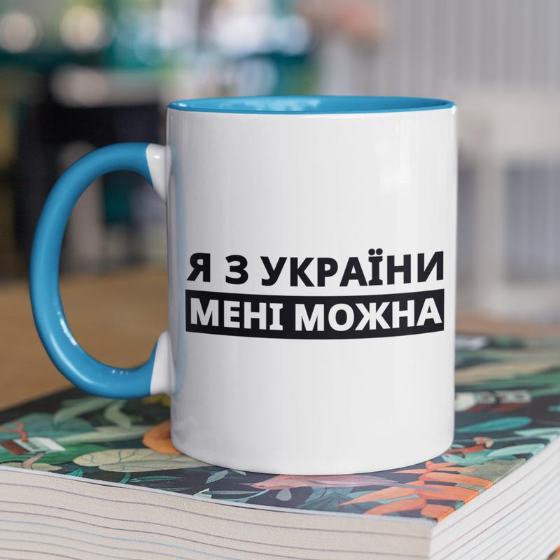 Чашка керамічна з принтом "я з україни" 330 мл, біла з блакитною ручкою