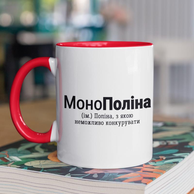 Чашка керамічна з принтом "монополіна" 330 мл, біла з червоною ручкою