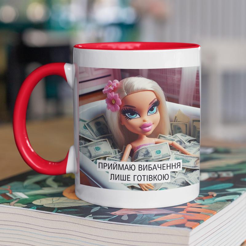 Чашка керамічна з принтом "приймаю вибачення лише готівкою" 330 мл, біла з червоною ручко...