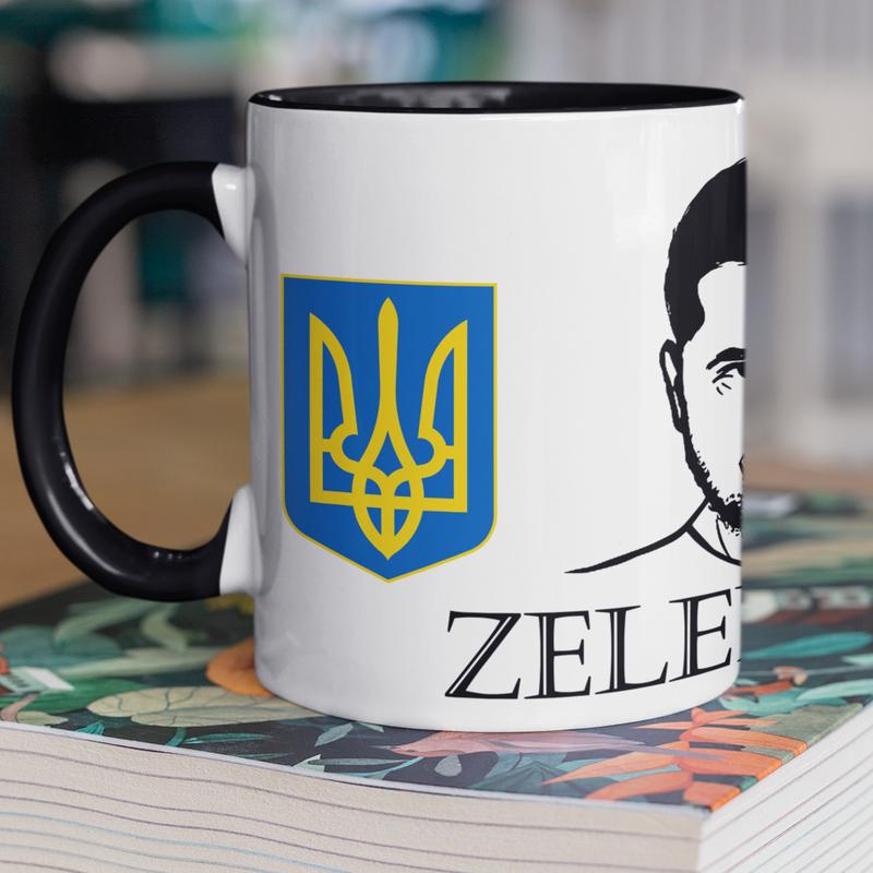 Чашка керамічна з принтом "зеленський" 330 мл, біла з чорною ручкою