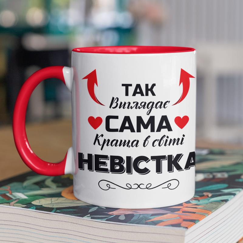 Чашка керамічна з принтом "так виглядає сама краща в світі невістка" 330 мл, біла з червон...