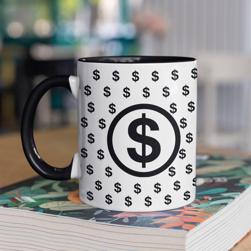 Чашка керамічна з принтом "долар" 330 мл, біла з чорною ручкою