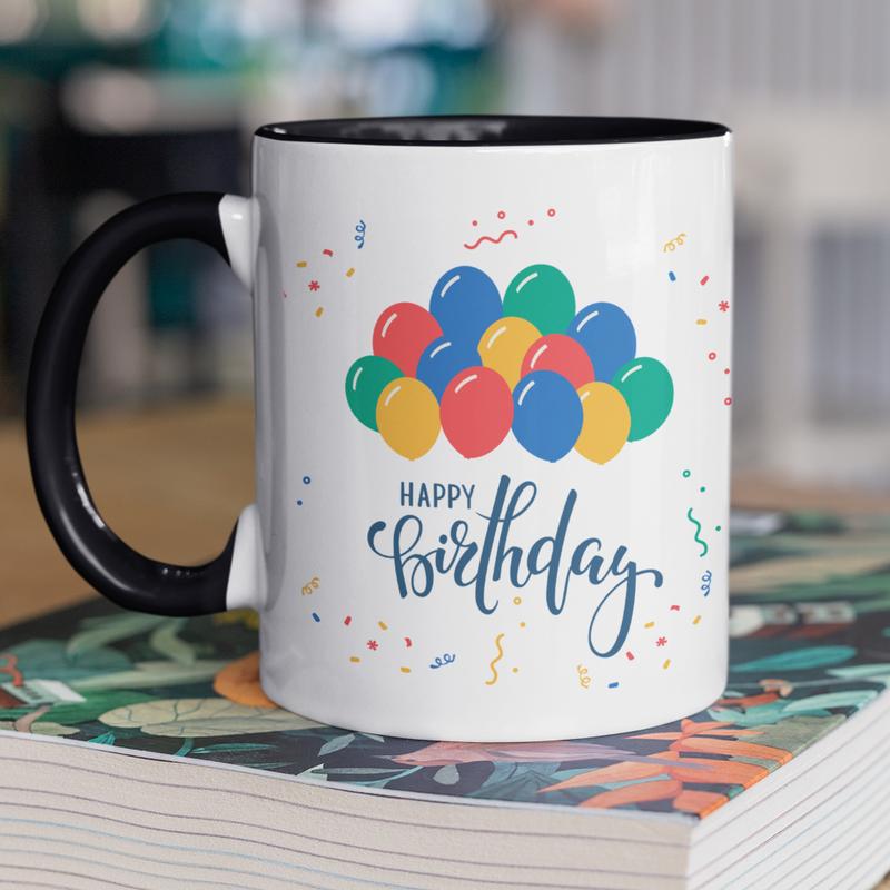 Чашка керамічна з принтом "happy birthday" 330 мл, біла з чорною ручкою