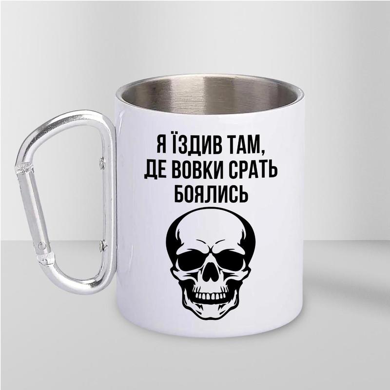 Чашка металева з принтом "я їздив там де вовки боялись" 300 мл з карабіном, біла