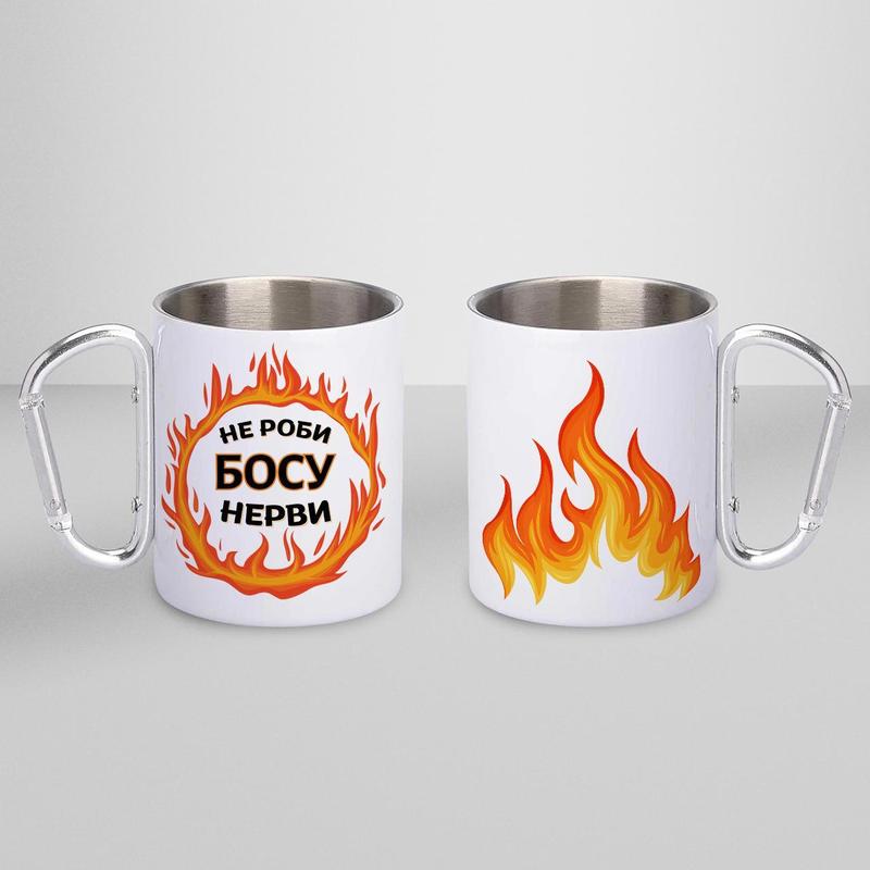 Чашка металева з принтом "не роби босу нерви" 300 мл з карабіном, біла