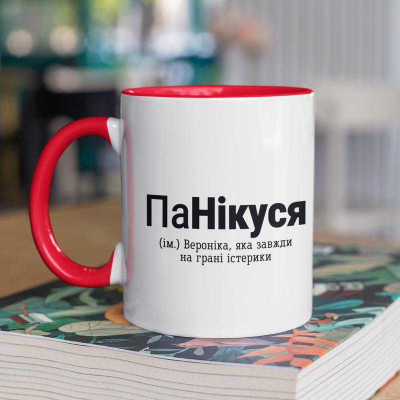 Чашка керамічна з принтом "панікуся" 330 мл, біла з червоною ручкою