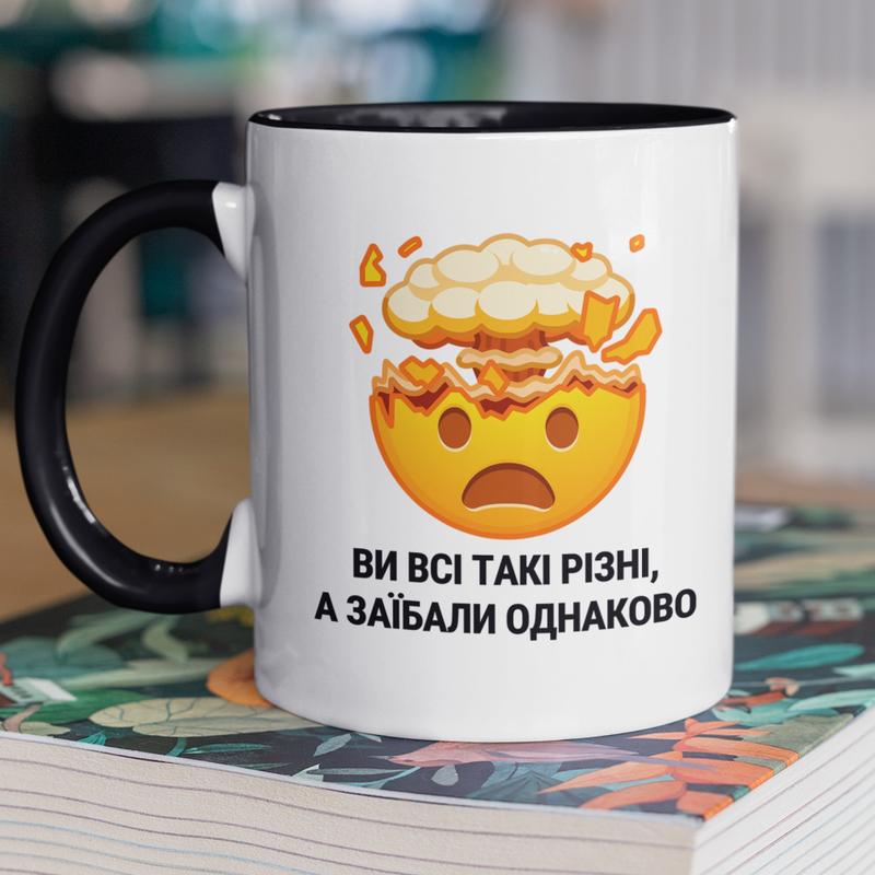Чашка керамічна з принтом "ви всі такі різні а заїбали однаково" 330 мл, біла з чорною руч...