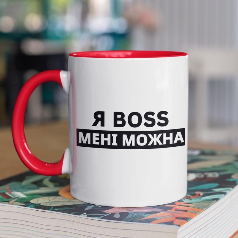 Чашка керамічна з принтом "я boss мені можна" 330 мл, біла з червоною ручкою