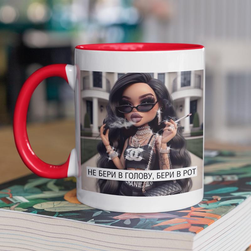 Чашка керамічна з принтом "не бери в голову" 330 мл, біла з червоною ручкою