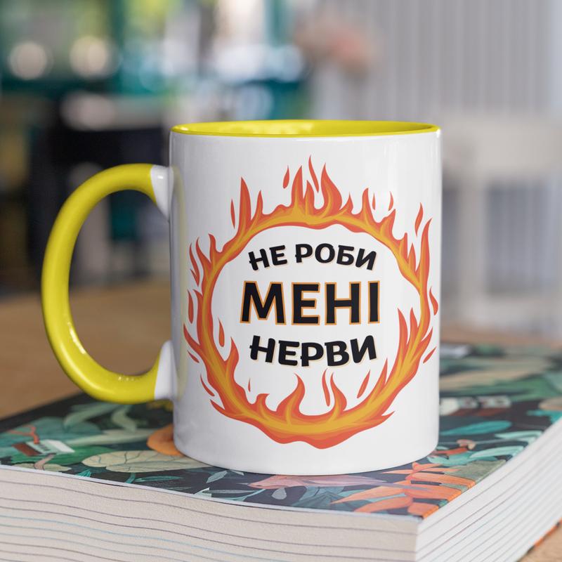 Чашка керамічна з принтом "не роби мені нерви" 330 мл, біла з жовтою ручкою