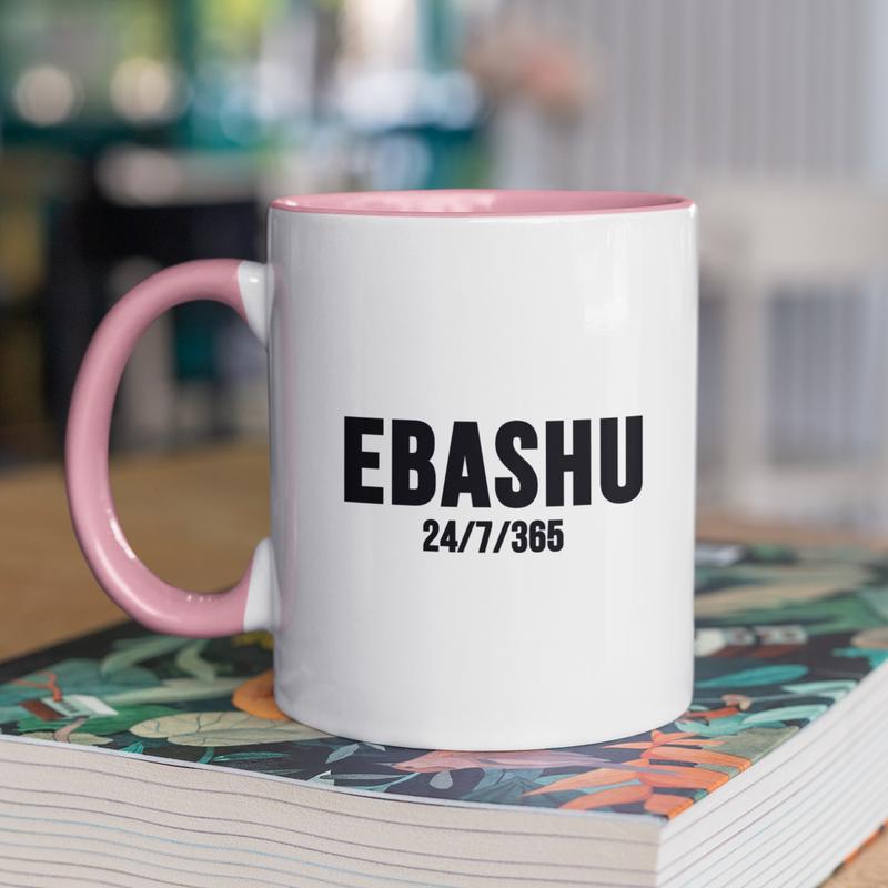 Чашка керамічна з принтом "ebashu" 330 мл, біла з рожевою ручкою