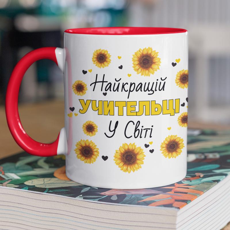Чашка керамічна з принтом "найкращій учительці у світі" 330 мл, біла з червоною ручкою
