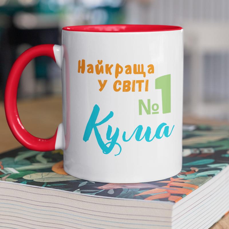 Чашка керамічна з принтом "найкраща у світі кума" 330 мл, біла з червоною ручкою