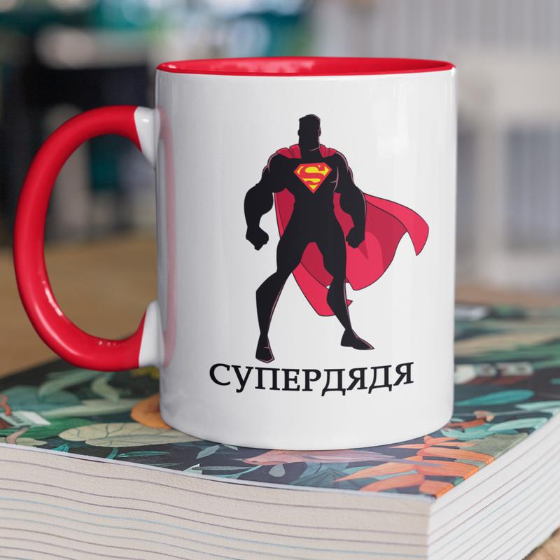 Чашка керамічна з принтом "супердядя" 330 мл, біла з червоною ручкою