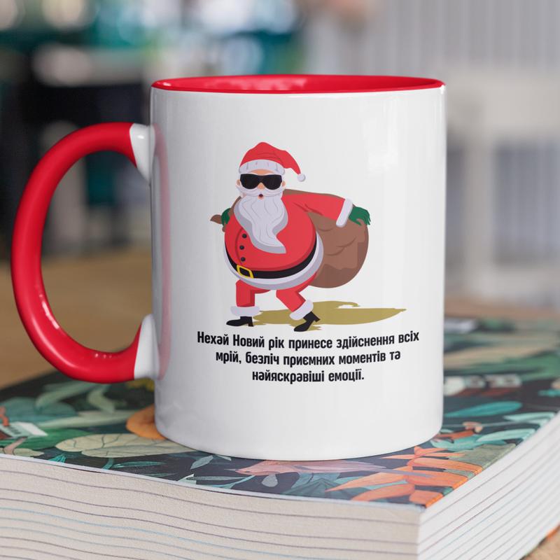 Чашка керамічна з принтом "новорічна" 330 мл, біла з червоною ручкою