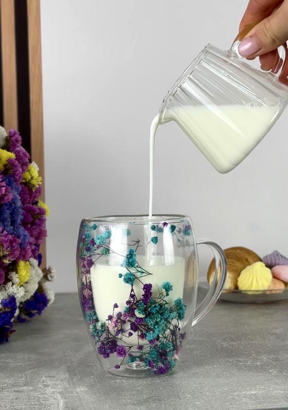Чашка з подвійними стінками з сухоцвітами, 350 мл — це справжнє поєднання естетики, затишку та практичності. 🌸 Виготовлена з прозорого термостійкого боросилікатного скла, вона створює ефект легкості, а вмонтовані всередину сухоцвіти надають їй унікального вигляду — кожна чашка неповторна, як витвір мистецтва. Подвійні стінки не лише красиво виглядають, а й зберігають температуру напою довше — гарячий чай чи кава не обпікають руки, а холодні напої не покриваються конденсатом. ✨ Переваги чашки: Об’єм 350 мл — ідеальний для кави, чаю, какао чи трав’яних настоїв; Подвійні стінки з ефектом термоізоляції; Живі кольори сухоцвітів всередині скла створюють особливий настрій; Елегантна форма з ручкою — зручно тримати навіть з гарячим напоєм; Стає чудовим подарунком для поціновувачів краси та затишку. 🌿 Стиль, ніжність і натхнення в кожному ковтку!