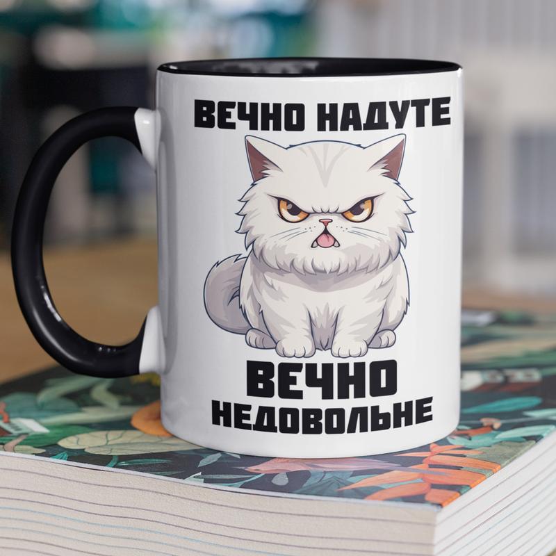 Чашка керамічна з принтом "вєчно недовольне" 330 мл, біла з чорною ручкою