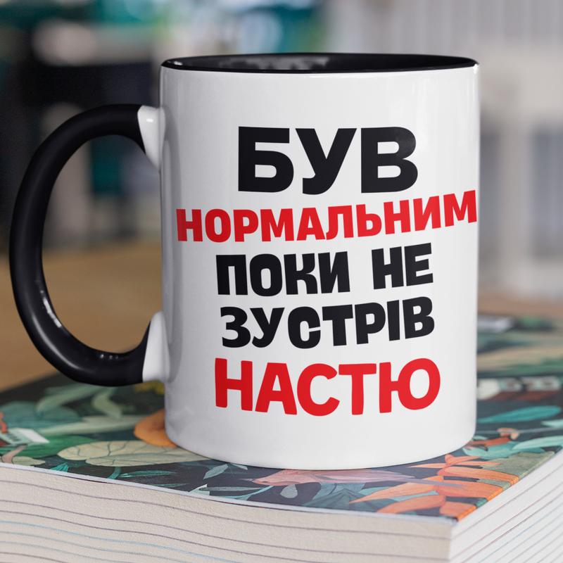 Чашка керамическая с принтом "був нормальным пока не навстречу настю" 330 мл, белая с черн...