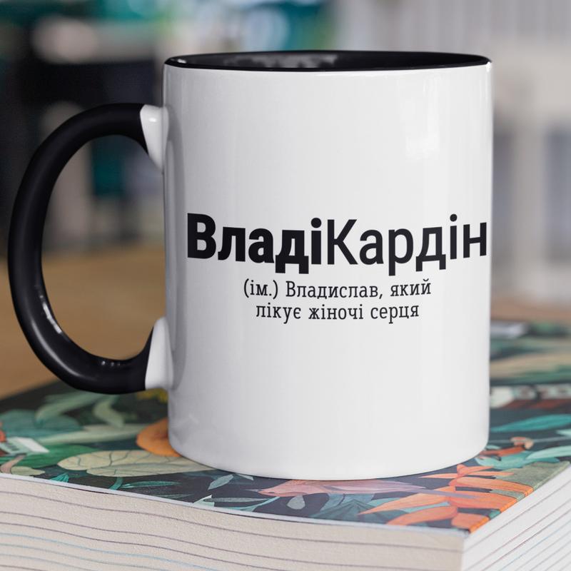 Чашка керамическая с принтом "владикардин" 330 мл, белая с черной ручкой