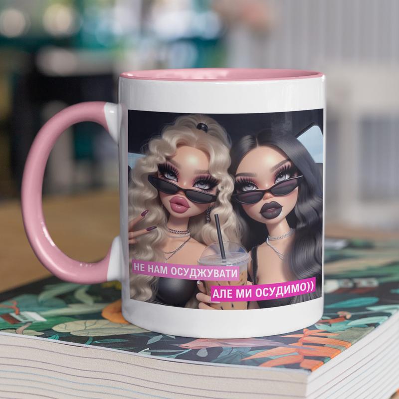 Чашка керамическая с принтом "мы осудим" 330 мл, белая с розовой ручкой