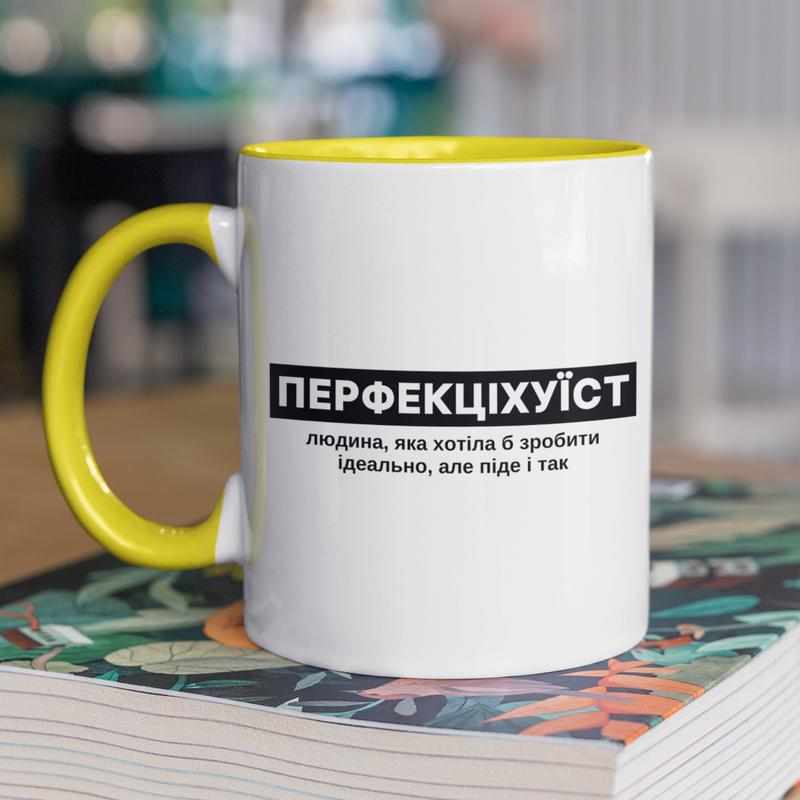 Чашка керамическая с принтом "перфекцихеист" 330 мл, белая с желтой ручкой