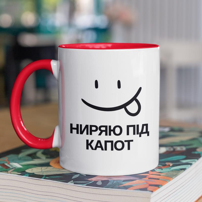 Чашка керамічна з принтом "ниряю під капот" 330 мл, біла з червоною ручкою