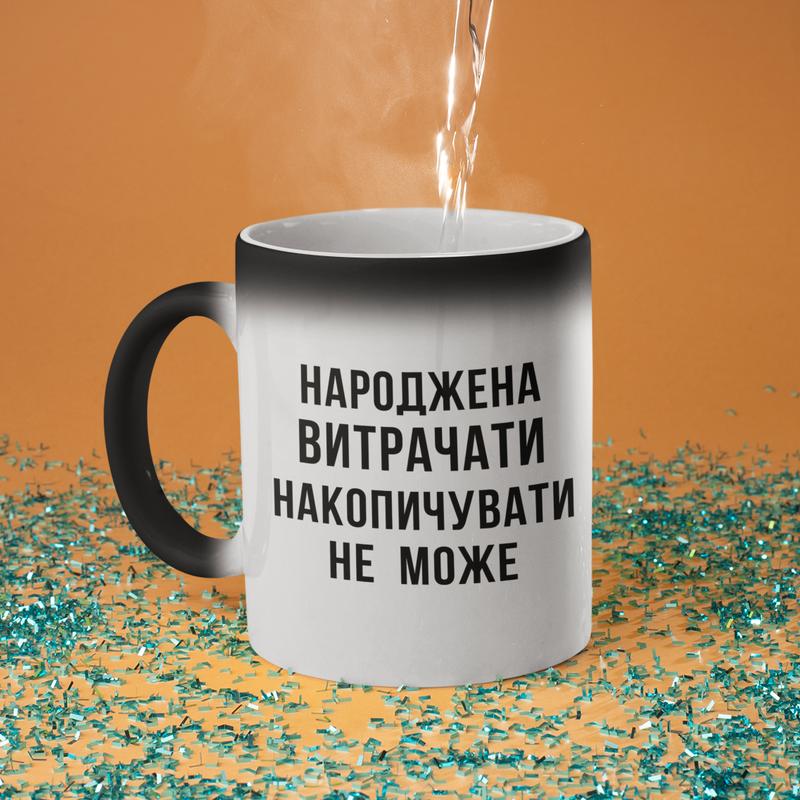 Чашка хамелеон керамічна з принтом "народжена витрачати" 330 мл