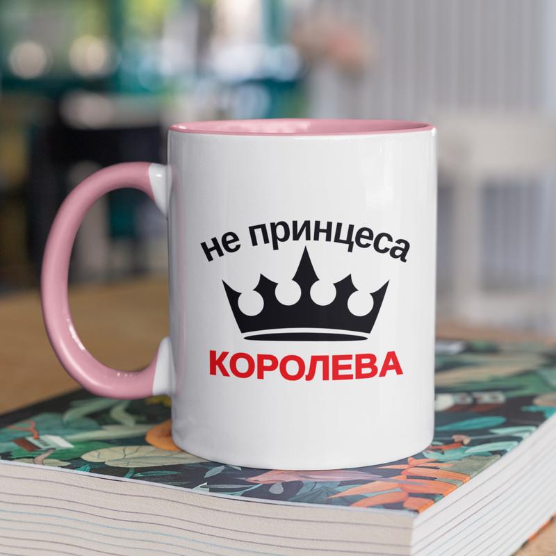 Чашка керамическая с принтом "не принцесса королева" 330 мл, белая с розовой ручкой