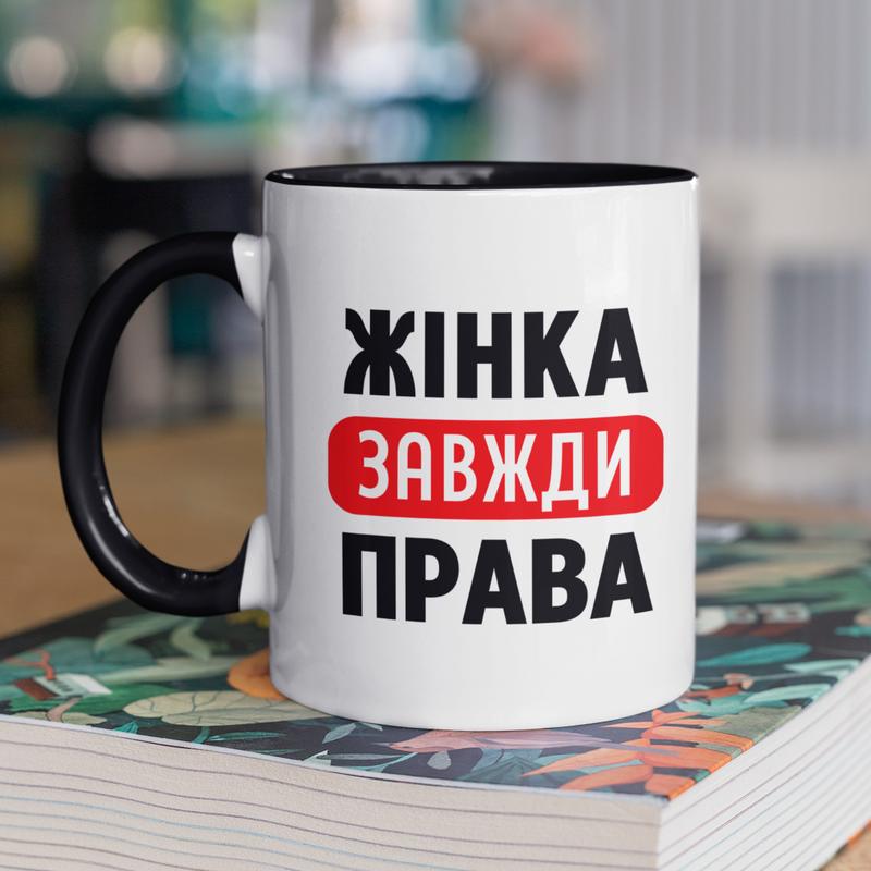Чашка керамическая с принтом "женка всегда правая" 330 мл, белая с черной ручкой