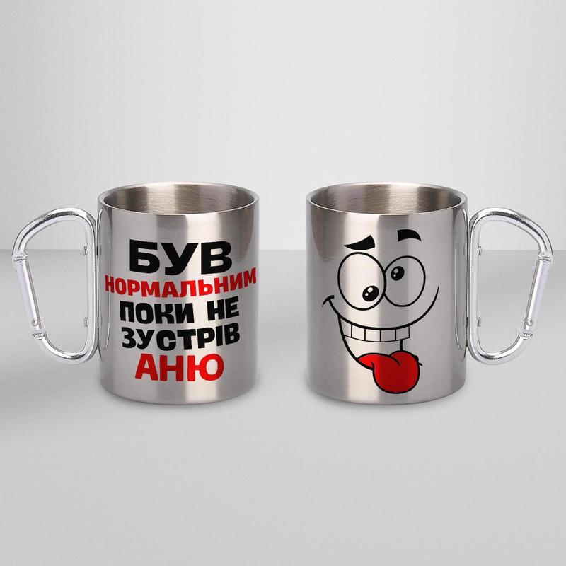 Кружка металева з карабіном "був нормальним поки не зустрів аню" 300 мл срібляста
