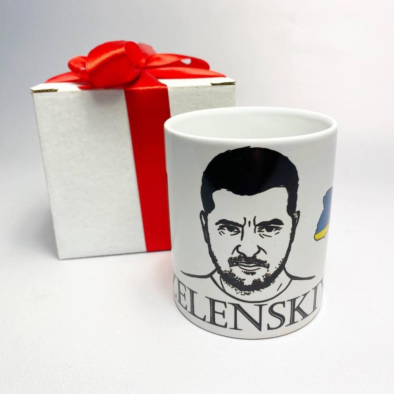 Круглая керамическая с принтом "зеленский" 330 мл в подарочной коробке с бантом