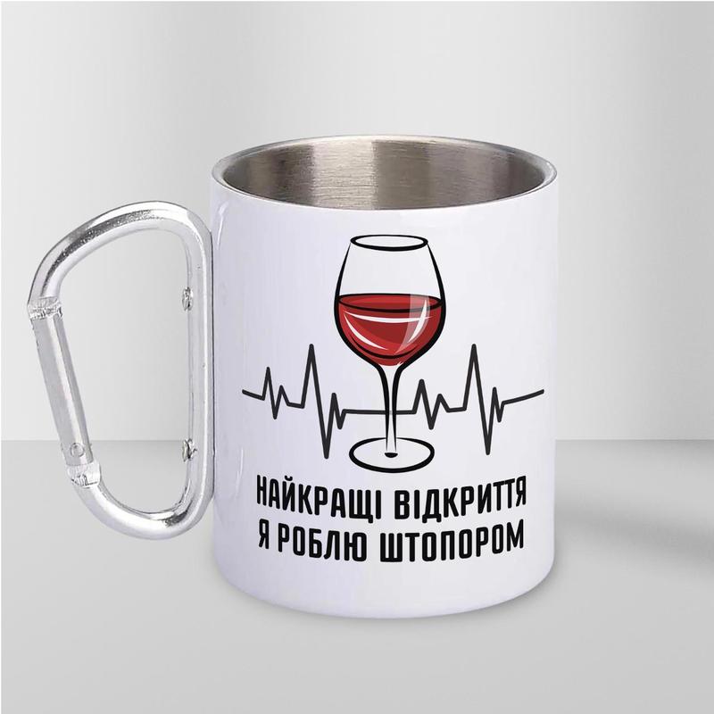 Кружка металлическая с карабином "лучшие открытия я выполняю штопором" 300 мл белая