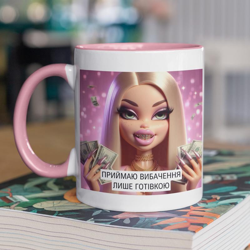 Чашка керамическая с принтом "принимаетизвиния только налички" 330 мл, белая с розовой руч...