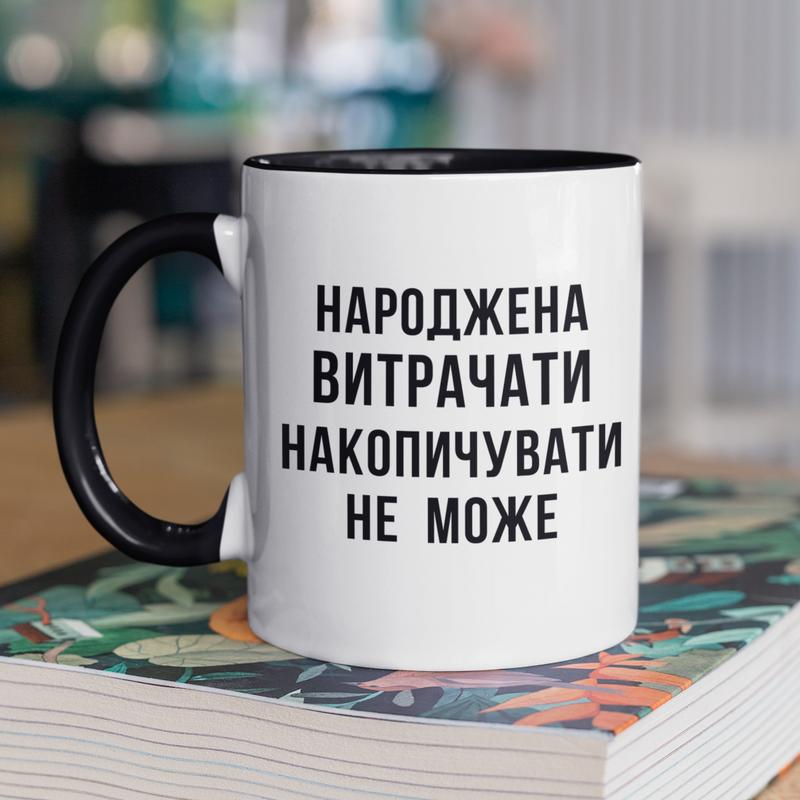 Чашка керамическая с принтом "розовая тратить" 330 мл, белая с черной ручкой