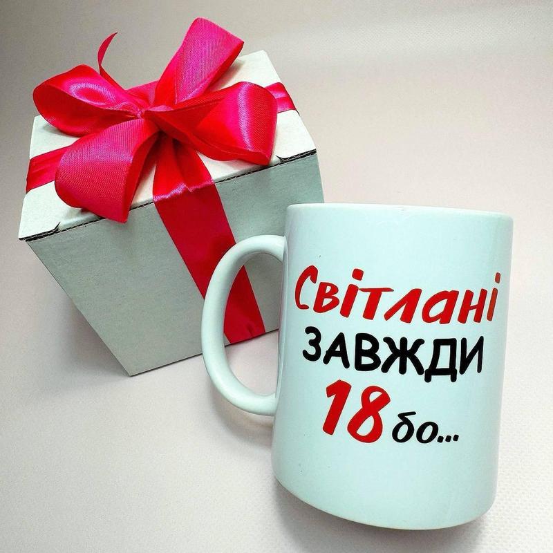 Круглая керамическая с принтом "светлани всегда 18" 330 мл в подарочной коробке с бантом