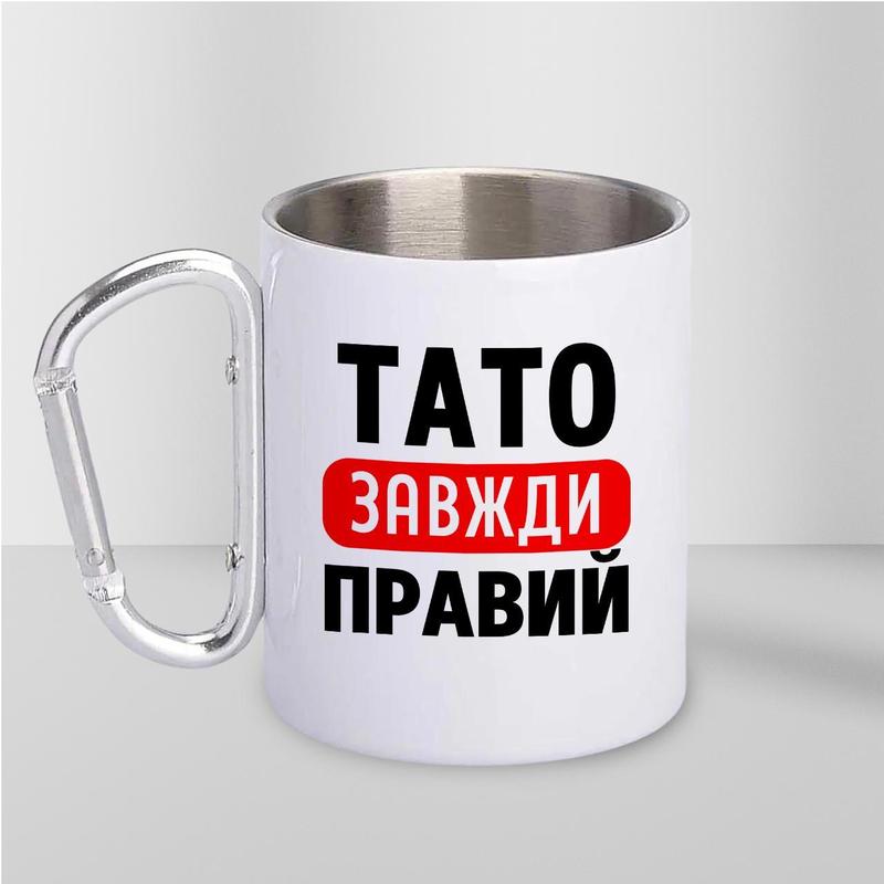 Чашка металева з принтом "тато завжди правий" 300 мл з карабіном, біла