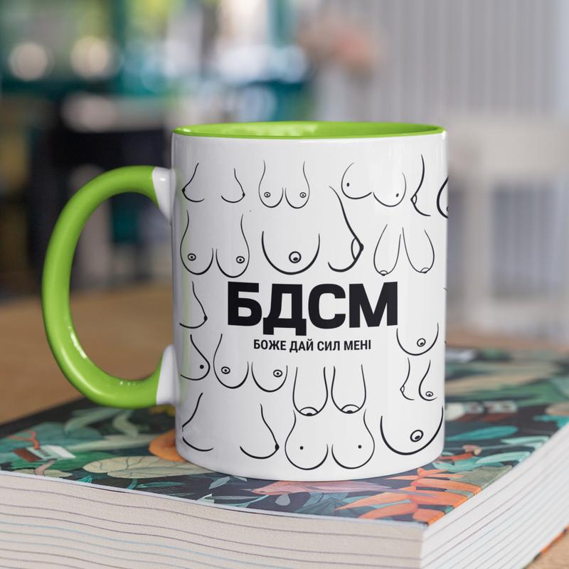 Чашка керамическая с принтом "бдсм безумная дай сил мне" 330 мл, белая с зеленой ручкой