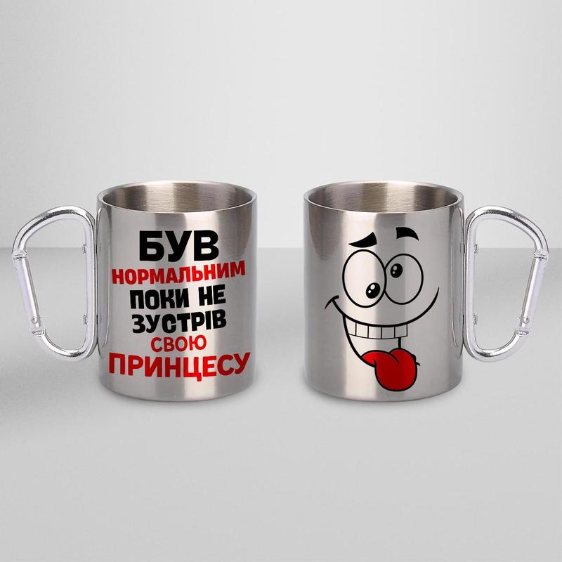 Чашка металева з принтом "був нормальним поки не зустрів принцесу" 300 мл з карабіном, срі...