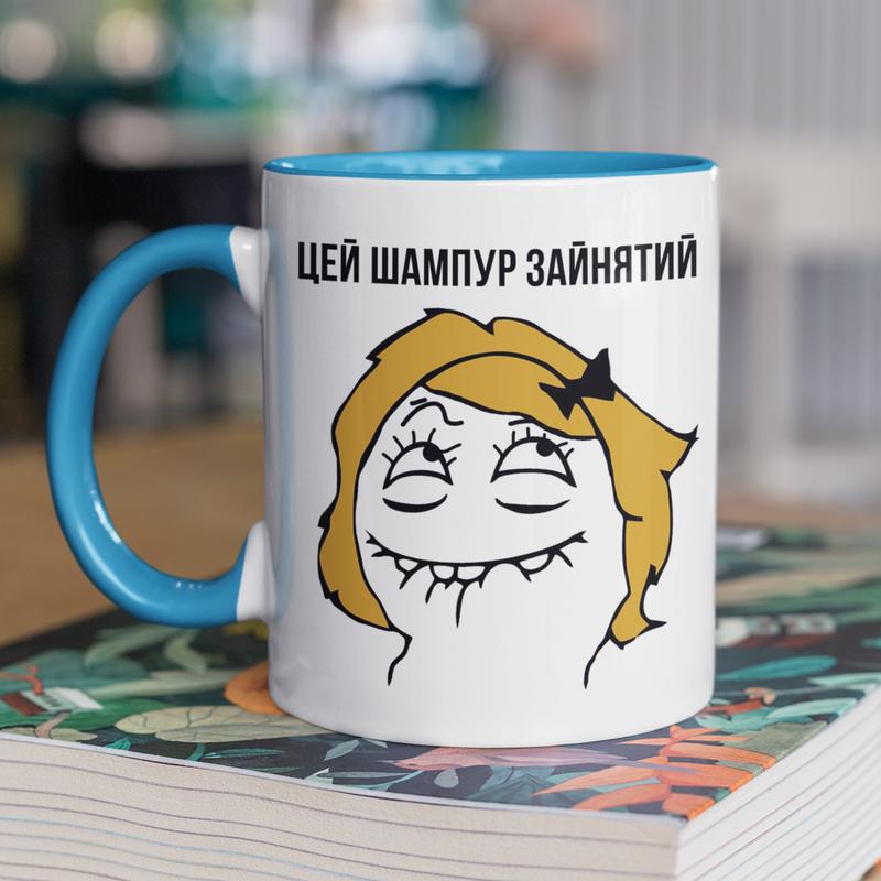 Чашка керамическая с принтом "этот шампур занят" 330 мл, белая с голубой ручкой