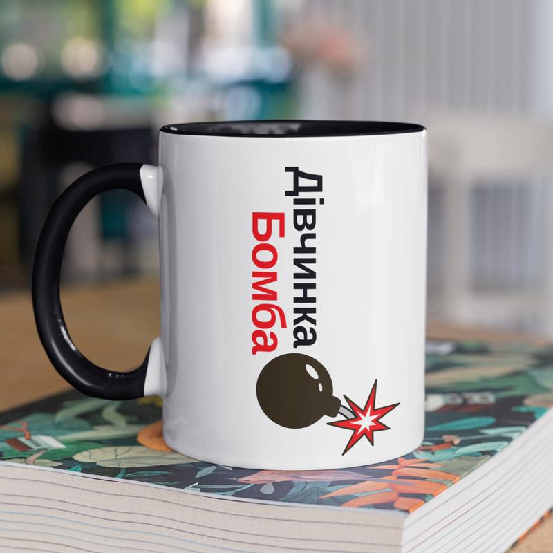 Чашка керамическая с принтом "девочка бомба" 330 мл, белая с черной ручкой