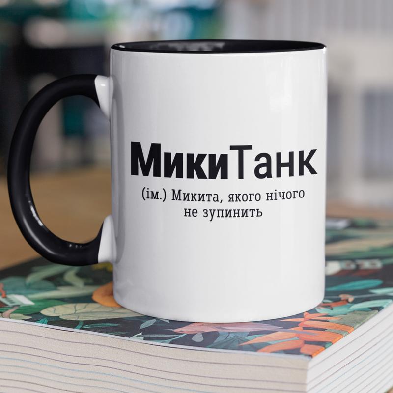 Чашка керамічна з принтом "микитанк" 330 мл, біла з чорною ручкою