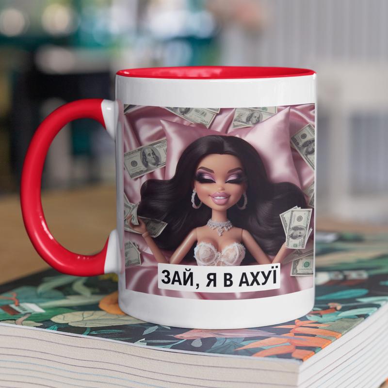 Чашка керамічна з принтом "зай я в ахуї" 330 мл, біла з червоною ручкою