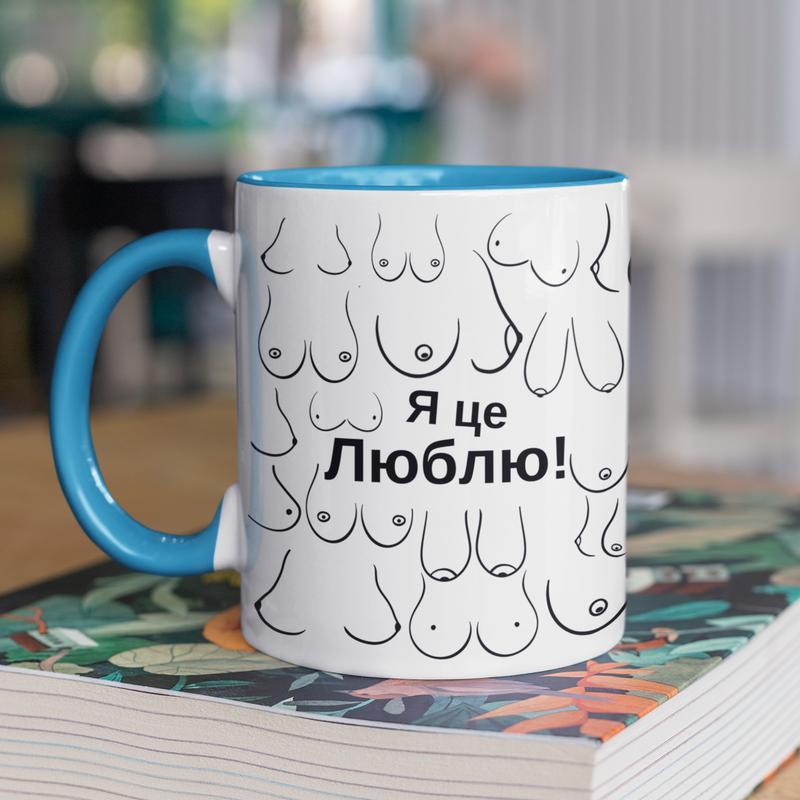 Чашка керамическая с принтом "я это люблю" 330 мл, белая с голубой ручкой