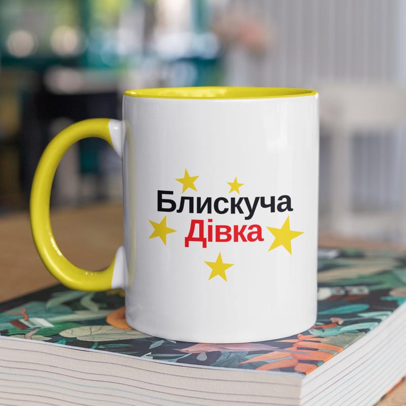 Чашка керамическая с принтом "блестящая давка" 330 мл, белая с желтой ручкой
