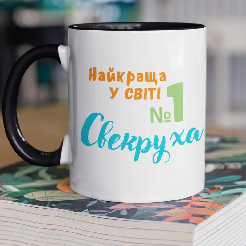Чашка керамическая с принтом "лучшая в мире свекруха" 330 мл, белая с черной ручкой