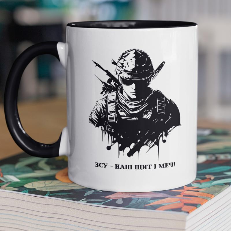 Чашка керамическая с принтом "зсу наш щит и меч" 330 мл, белая с черной ручкой