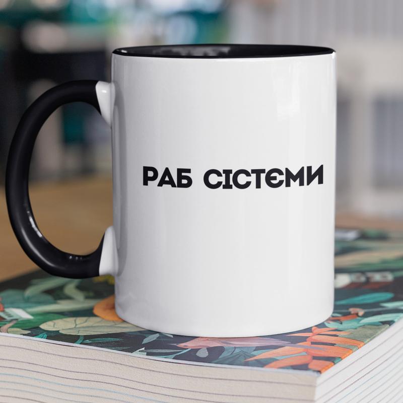 Чашка керамическая с принтом "раб системы" 330 мл, белая с черной ручкой