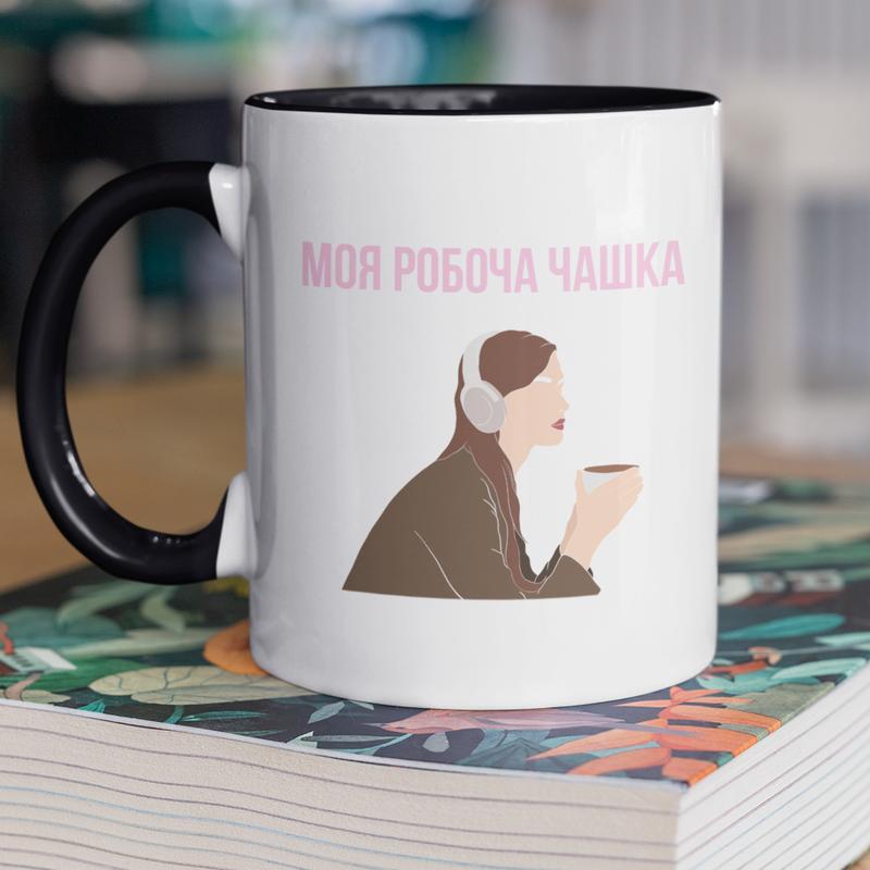 Чашка керамическая с принтом "моя рабочая чашка" 330 мл, белая с черной ручкой