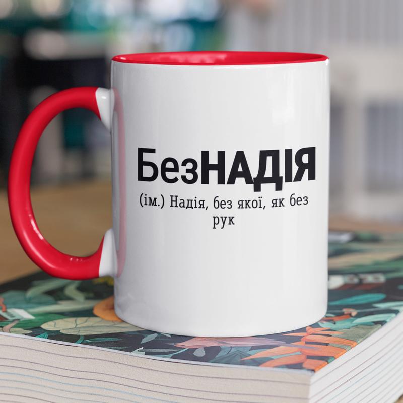 Чашка керамічна з принтом "безнадія" 330 мл, біла з червоною ручкою